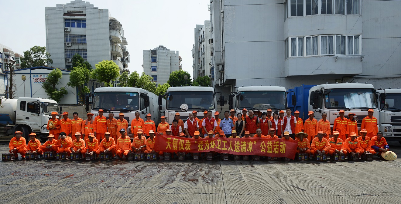 對環衛工人的關愛,體現了一個城市的文明程度,這不是表現在口頭上,而是體現在具體的行動中。為了號召廣大市民講文明、樹新風,共同參與城市環境衛生建設,同時緩解、分擔環衛工人的工作壓力,天信儀表集團有限公司黨工團婦于今年夏季再一次發起;我為環衛工人送清涼;的微公益活動。