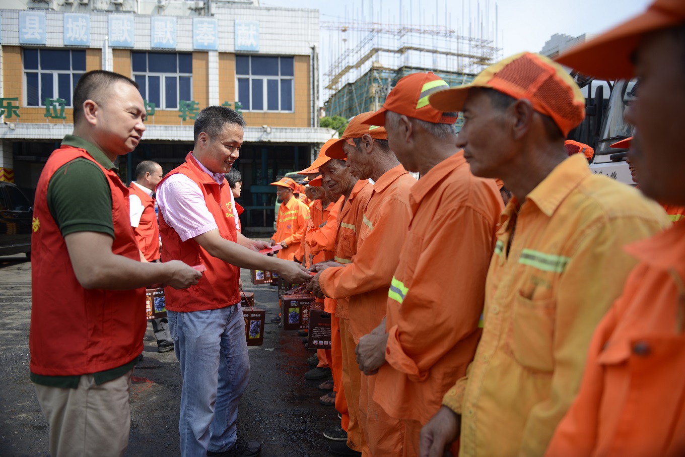 8月8日,天信公益志愿者服務隊在公司副總裁張華的帶領下,來到了位于康樂路的垃圾中轉站,將面值200元的超市購物券和價值100元的葡萄逐一地發放到51位環衛工人手中。當拿到天信發放的清涼物資時,環衛工人們臉上露出了真切的笑容。他們紛紛對天信的微公益活動表示感謝,并表示要繼續為美化城市環境做出更多的努力。
