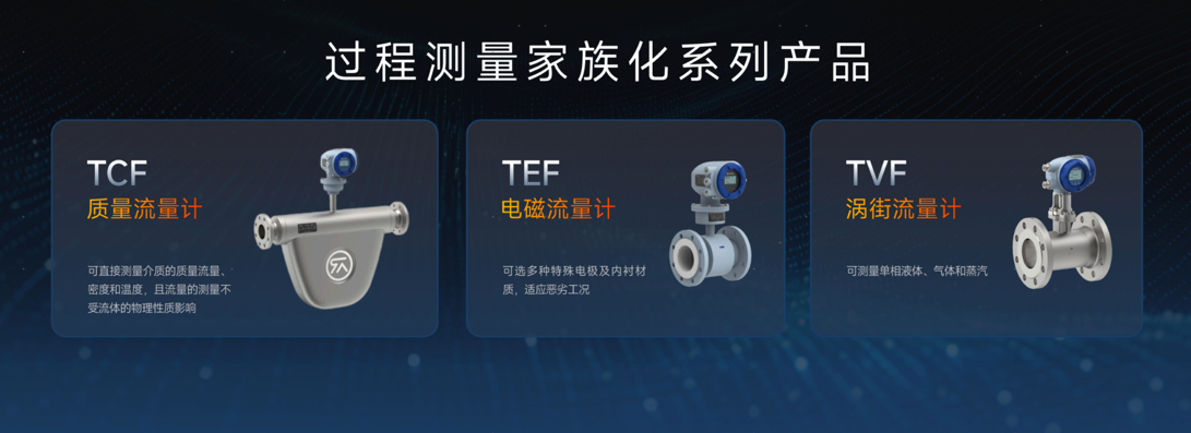 過(guò)程測(cè)量新產(chǎn)品:TCF質(zhì)量流量計(jì)、TEF電磁流量計(jì)、TVF渦街流量計(jì)。以“多場(chǎng)景適配、高精度覆蓋”為核心優(yōu)勢(shì),形成從常規(guī)壓力到超高壓、從氣體到液體的全產(chǎn)業(yè)鏈計(jì)量矩陣。